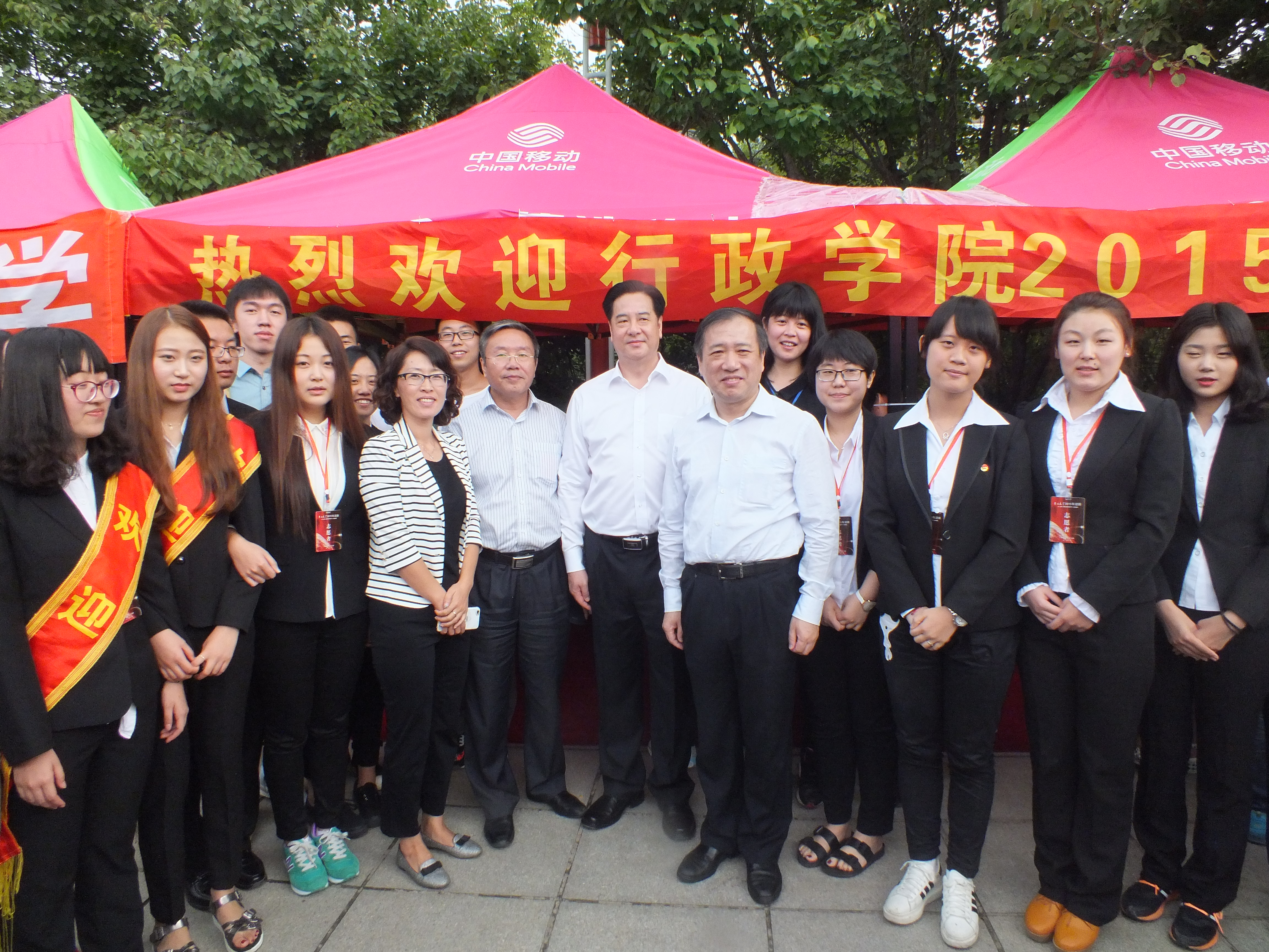 迎新接待处前,工作人员们与校领导合影留念。