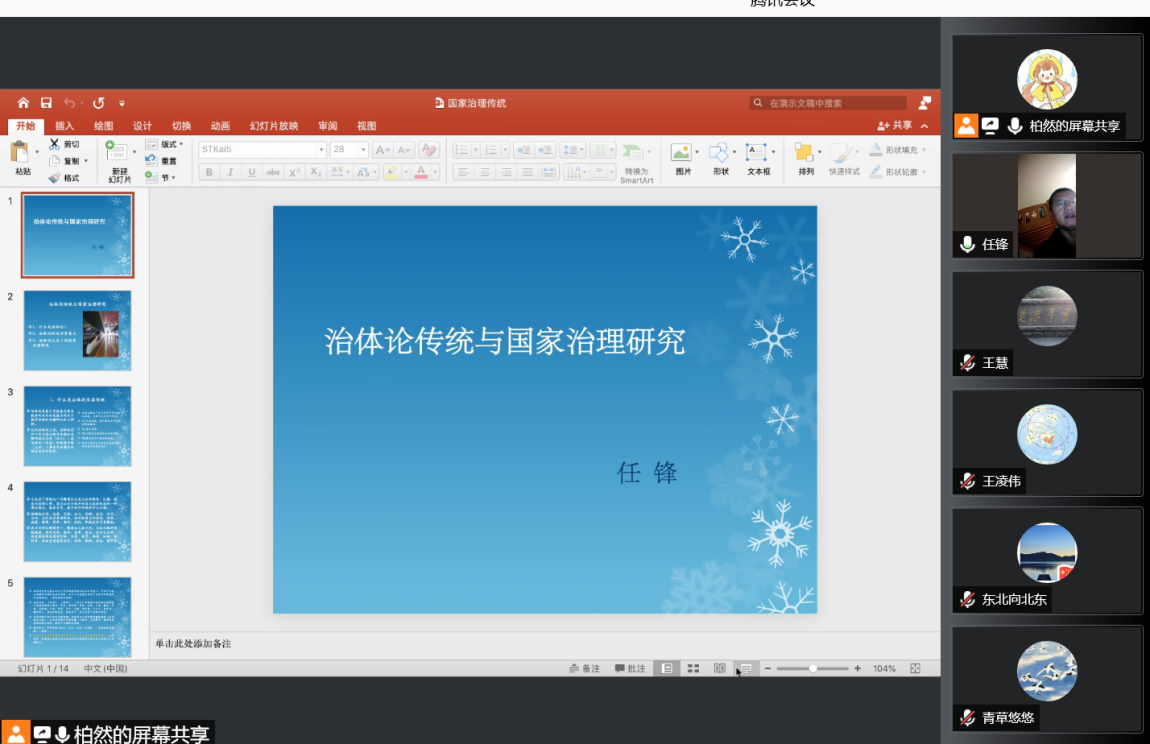庆祝建校75周年系列学术活动暨第56期中国政治研究工作坊在腾讯会议室举行。中国人民大学国际关系学院博士生导师、《中国政治学》(辑刊)主编、历史政治学研究中心副主任、《政治思想史》编委任锋教授应邀担任主讲嘉宾,作题为“治体论传统与国家治理研究”的学术讲座。成人导航