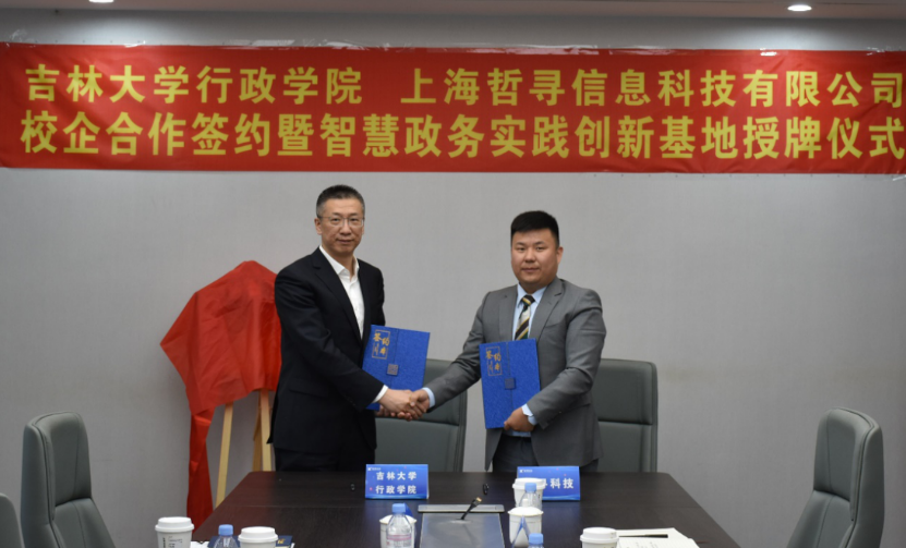 党委副书记史慕华、党委副书记兼副院长张洁、副院长刘雪华、研究生秘书宋佳晖一行赴上海哲寻信息科技有限公司交流访问,并成功签署“智慧政务实践创新基地”校企共建协议。上海哲寻信息科技有限公司总经理尹朝辉、副总经理徐坤、销售总监王继承等出席签约会。