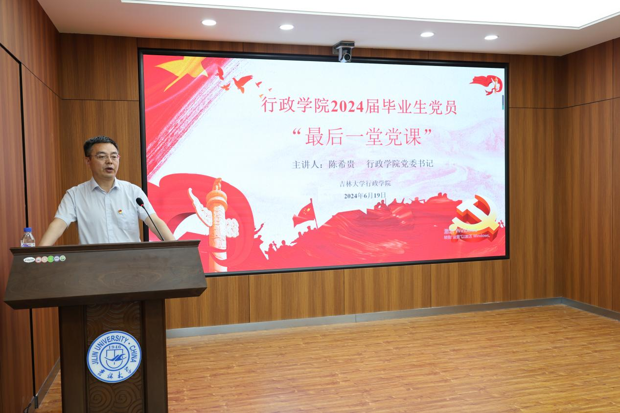 陈希贵以《牢记党员第一身份 做遵规守纪的合格党员》为题,从“头脑清醒牢记党员身份,行稳致远”出发,强调共产党人是劳动人民中普通的一员,是群众中的先进分子,分享部分“七一勋章”获得者事迹,勉励毕业生党员对党和人民要忠心耿耿、对工作要尽职尽责、对群众要满怀真情、对成绩要谦虚谨慎。从“以纪律规矩时刻约束自己,做一名合格党员”出发,陈希贵结合自身工作经历,领学习近平总书记关于纪律建设的重要论述,分别从政治纪律、组织纪律、廉洁纪律、群众纪律、工作纪律、生活纪律6个方面向毕业生党员解读最新版《中国共产党纪律处分条例》。结合党纪学习教育和毕业生党员教育管理要求,陈希贵向毕业生党员提出三点希望,一是不断锤炼党性修养,要坚定理想信念、常固理论根基、严守党规党纪,做政治上的“明白人”;二是高度珍视组织关系,要及时办理转接、妥善保管档案、过好组织生活,做支部里的“正规军”;三是带头发挥模范作用,要培养高尚情操、提高业务能力、彰显吉大风采,做社会中的“排头兵”。