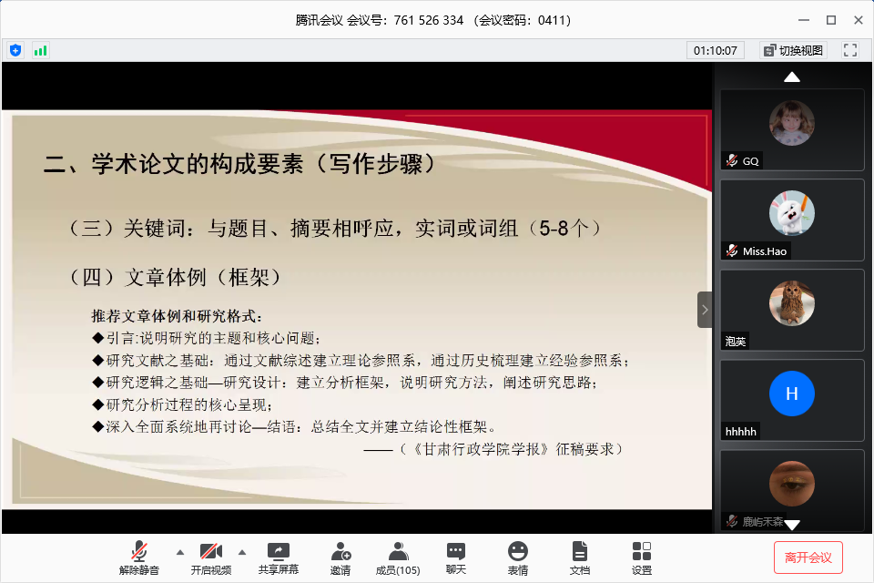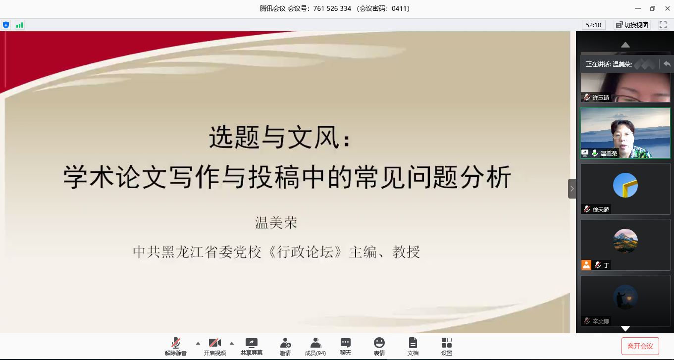 主办的教师科研水平助力计划第八期活动,在腾讯会议室举行。本次讲座邀请《行政论坛》主编,中国社会科学评价研究院评价专家委员会中国政治学科委员,省委党校、黑龙江省成人导航
