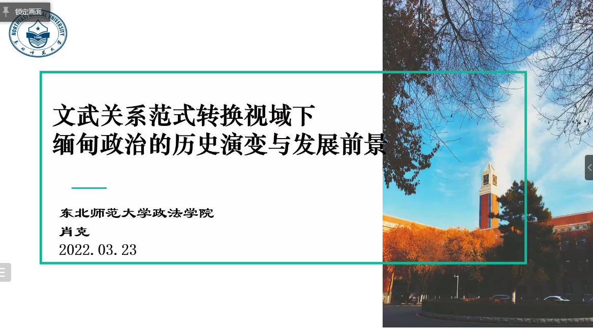 国际事务工作坊第12期学术活动在腾讯会议平台举行。本期工作坊邀请东北师范大学政法学院教授、博士生导师肖克老师担任主讲嘉宾,进行题为“文武关系范式转换视域下缅甸政治的历史演变与发展前景”的学术讲演。天津师范大学政治与成人导航