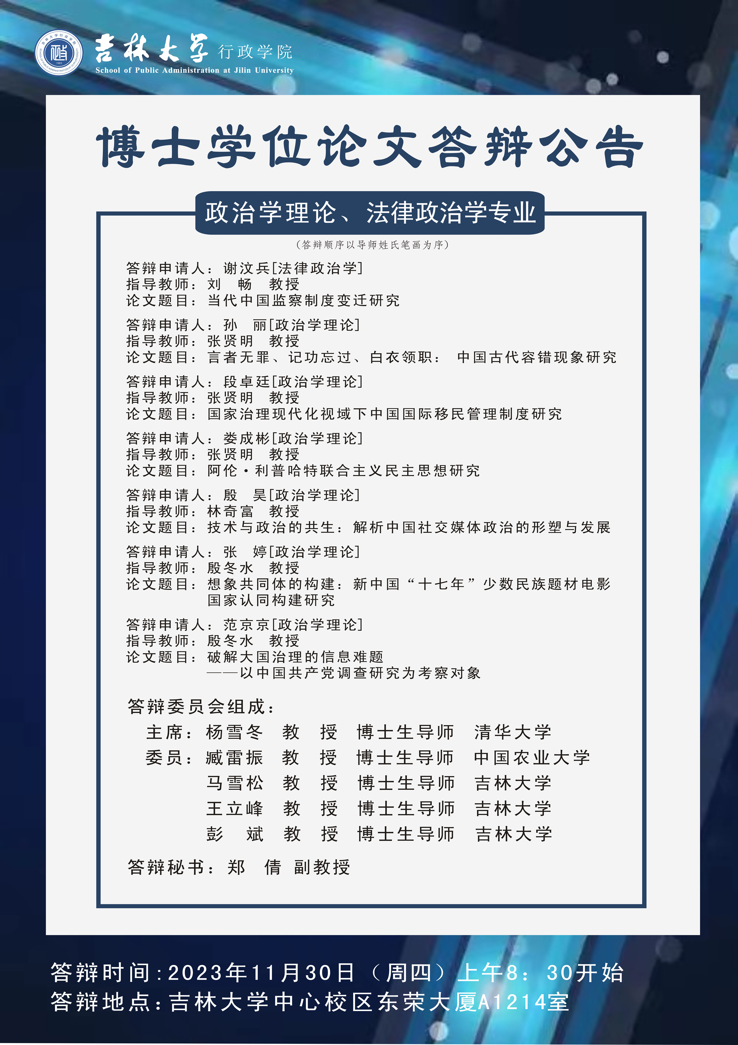 第一组:行政管理、公共治理与公共政策专业-博士学位论文答辩:2023年11月28日(周二)上午08:30开始,答辩地点:成人导航 中心校区东荣大厦A1214会议室