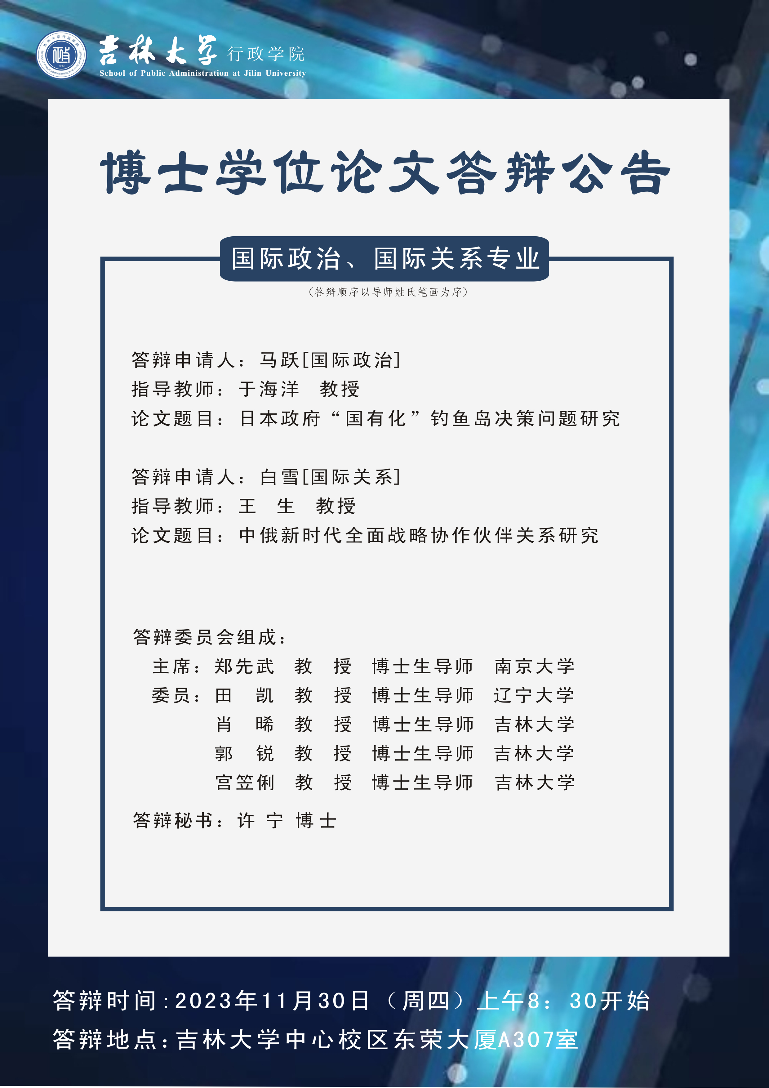 第二组:国际政治、国际关系专业-博士学位论文答辩:2023年11月30日(周四)上午08:30开始,答辩地点:成人导航 中心校区东荣大厦A307会议室