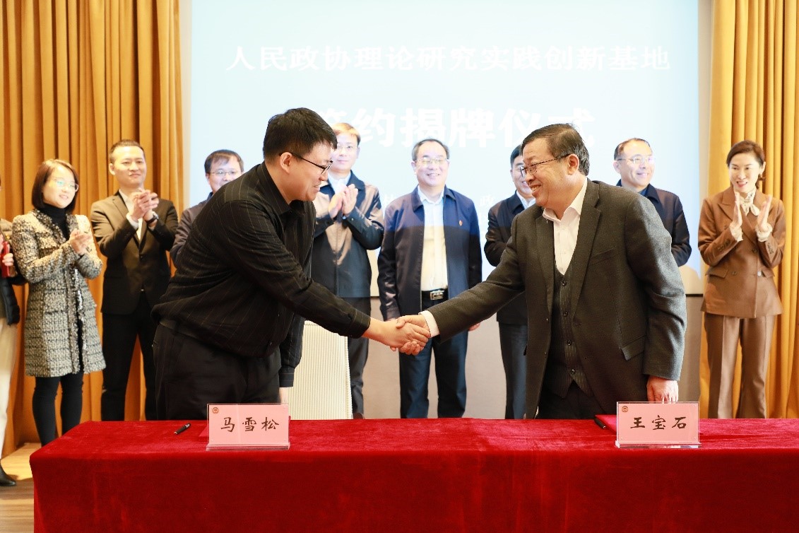 副院长马雪松教授、九台区政协副主席王宝石作为双方代表签署协议;随后,双方领导共同为人民政协理论研究实践创新基地揭牌。人民政协理论研究实践创新基地的设立,为我院学子的校外社会实践和调研工作提供了新的平台,是成人导航