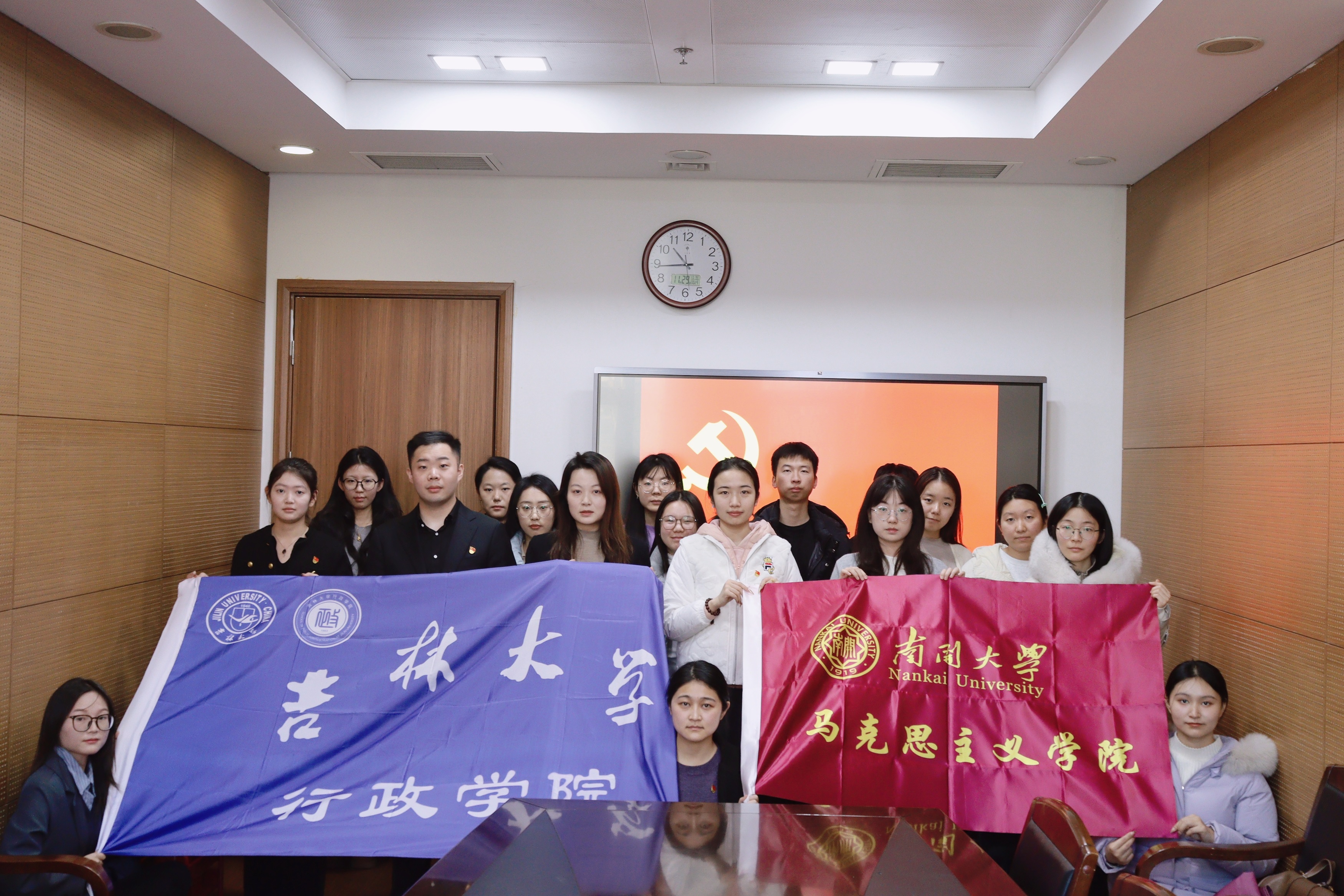 硕士学生第三党支部书记谷瑛淏、本科学生党支部书记高卓嫱、研究生党员代表程静赴南开大学马克思主义学院开展双联双建活动,南开大学马克思主义学院硕士4班党支部全体成员参与此次活动。