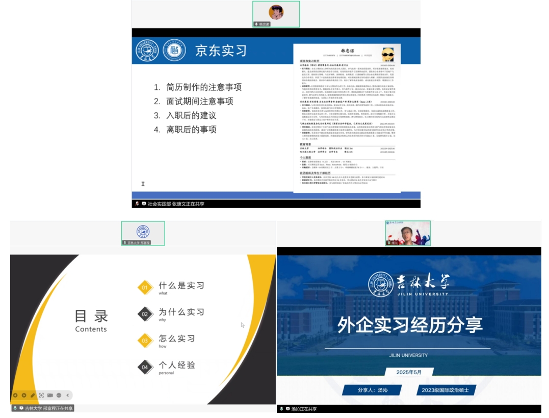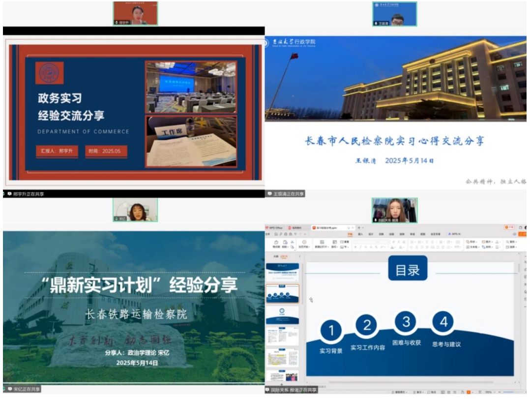 深耕政务实践,明晰职业方向。在政府实习经验分享环节,2023级应急管理硕士研究生邢宇升以吉林省商务厅实习经历为例,强调作为一名实习生小白在进入新的工作场域时,要始终保持一种虚心的态度去不断学习;2023级行政管理硕士王银清基于长春市人民检察院的实习感悟,提出“规划先行、技能储备、主动拓岗、形象管理”四维建议;2024级政治学理论硕士研究生宋亿详述长春铁路运输检察院工作实况,就实习环境适应问题给出针对性解答;2024级国际关系硕士研究生殷渴结合鼎新实习计划面试经历,分享了政务岗位选拔要点及应答策略。