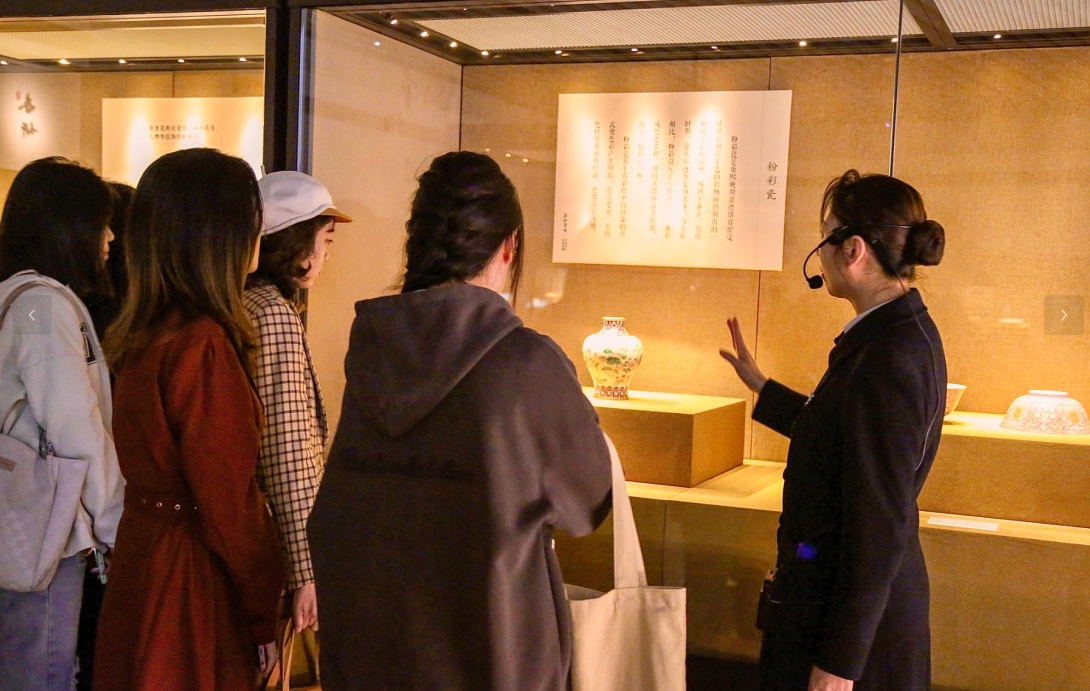 “春和景明——明清精品瓷器展”中,精美的明清瓷器展示了中国制瓷技艺的卓越成就。展厅内书法、古诗词、纸雕、古典音乐等元素的交织相映,生动呈现出一幅“春和景明”的画卷。在欣赏瓷器之美的同时,同学们也感受到了中华文明的博大精深与悠久传承。