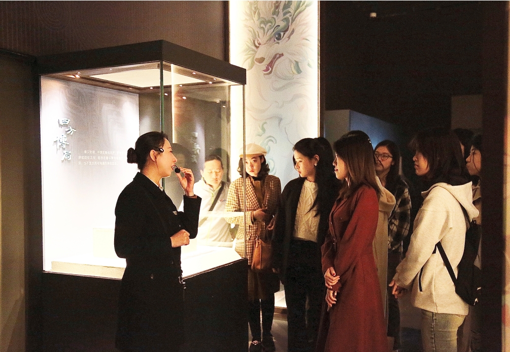 在讲解员的专业引导下,参观团成员依次参观了博物馆内的四大展区:“吾道何之——精品书画展”“国色天工——中国传统技艺展”“山海爵——青铜器展”和“春和景明——明清精品瓷器展”。每一件展品均承载着中国悠久的历史和深厚的文化底蕴,参观同学们在欣赏过程中深入思考文化遗产的保护与传承,进一步加深了对历史文化的理解与敬意。
