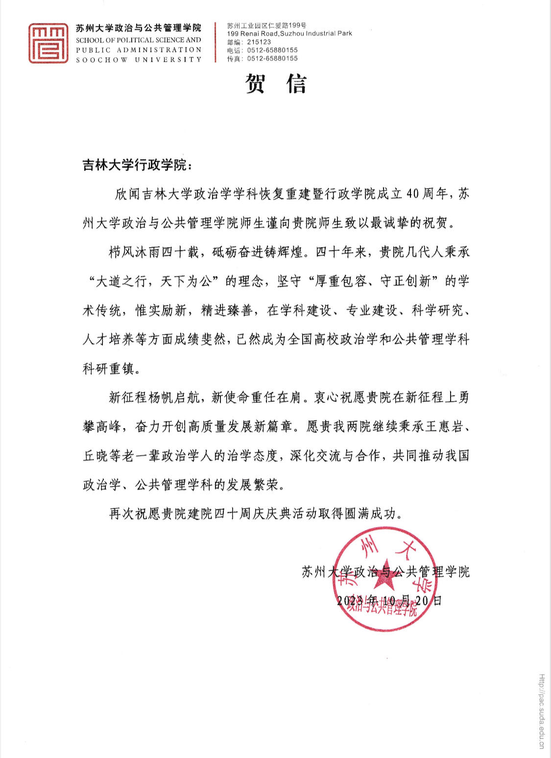 苏州大学政治与公共管理学院的贺信