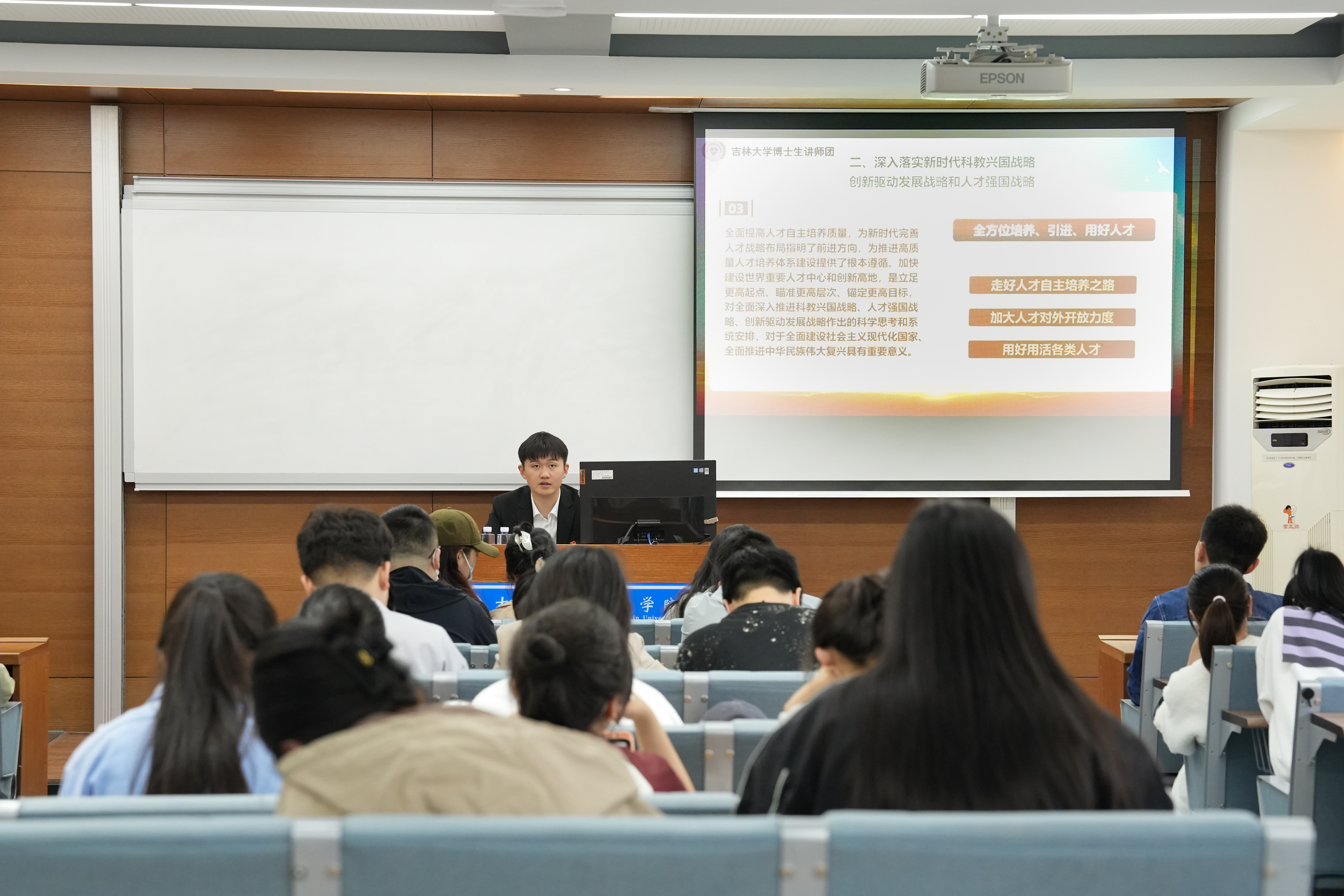 为深入学习贯彻全国两会精神,充分发挥博士生讲师团理论宣讲作用,2024年5月16日,成人导航 博士生讲师团讲师王嘉玮走进成人导航 开展“学习贯彻两会精神 聚力中国式现代化”宣讲系列活动。本次宣讲的题目是“坚持教育科技人才强国建设一体化推进,注入新质生产力发展澎湃动能”。成人导航 部分研究生参加了本次活动。